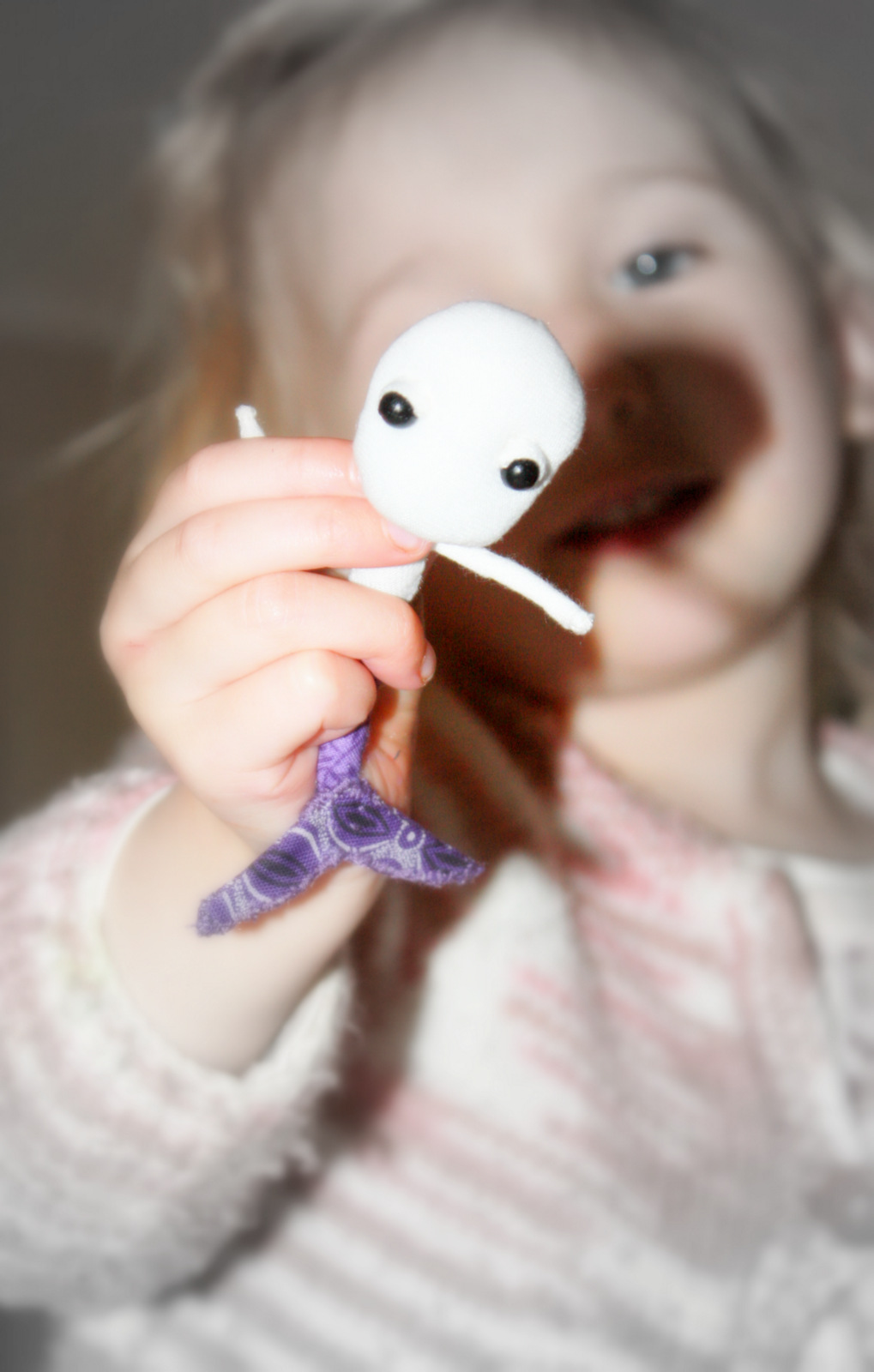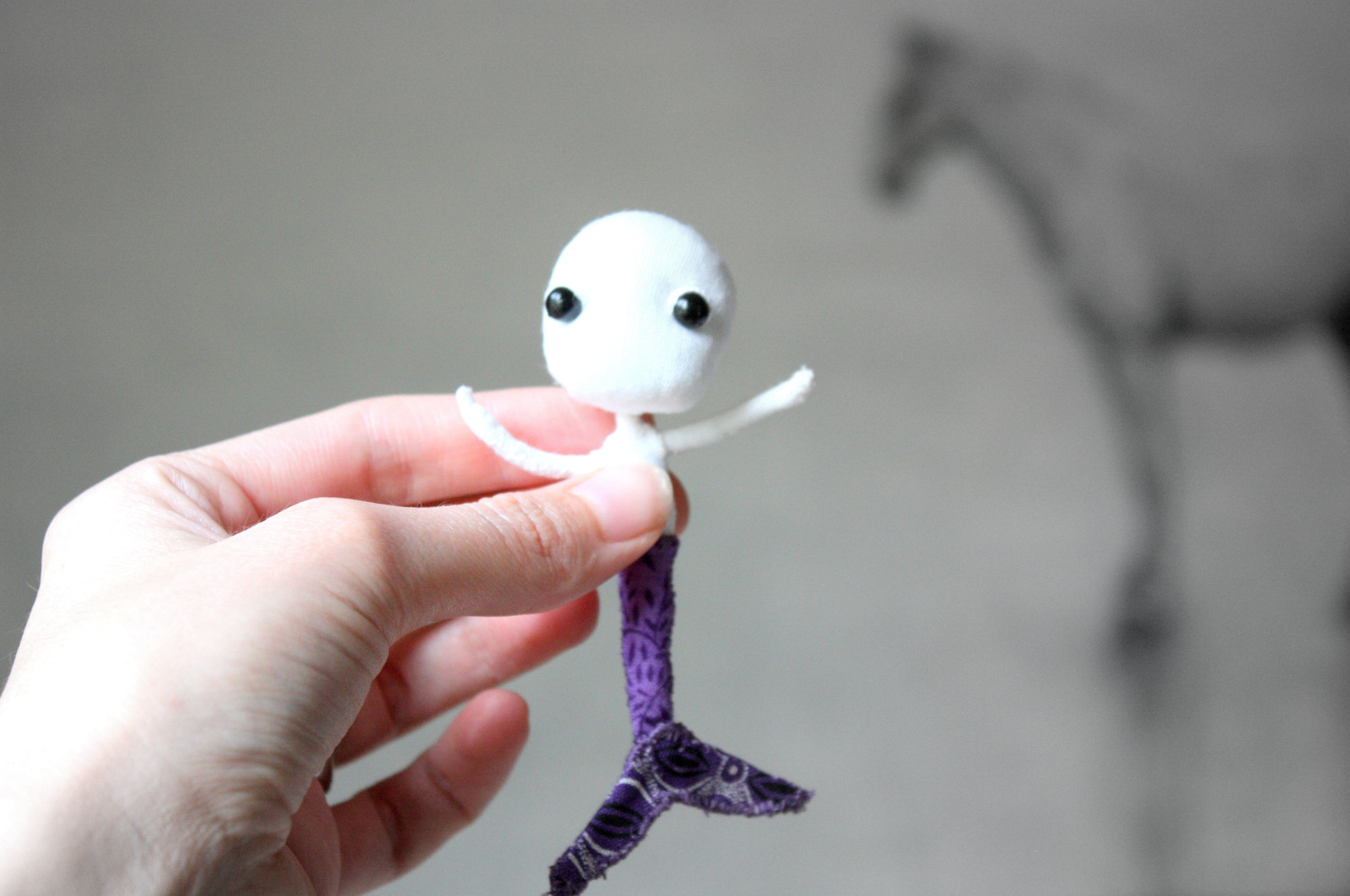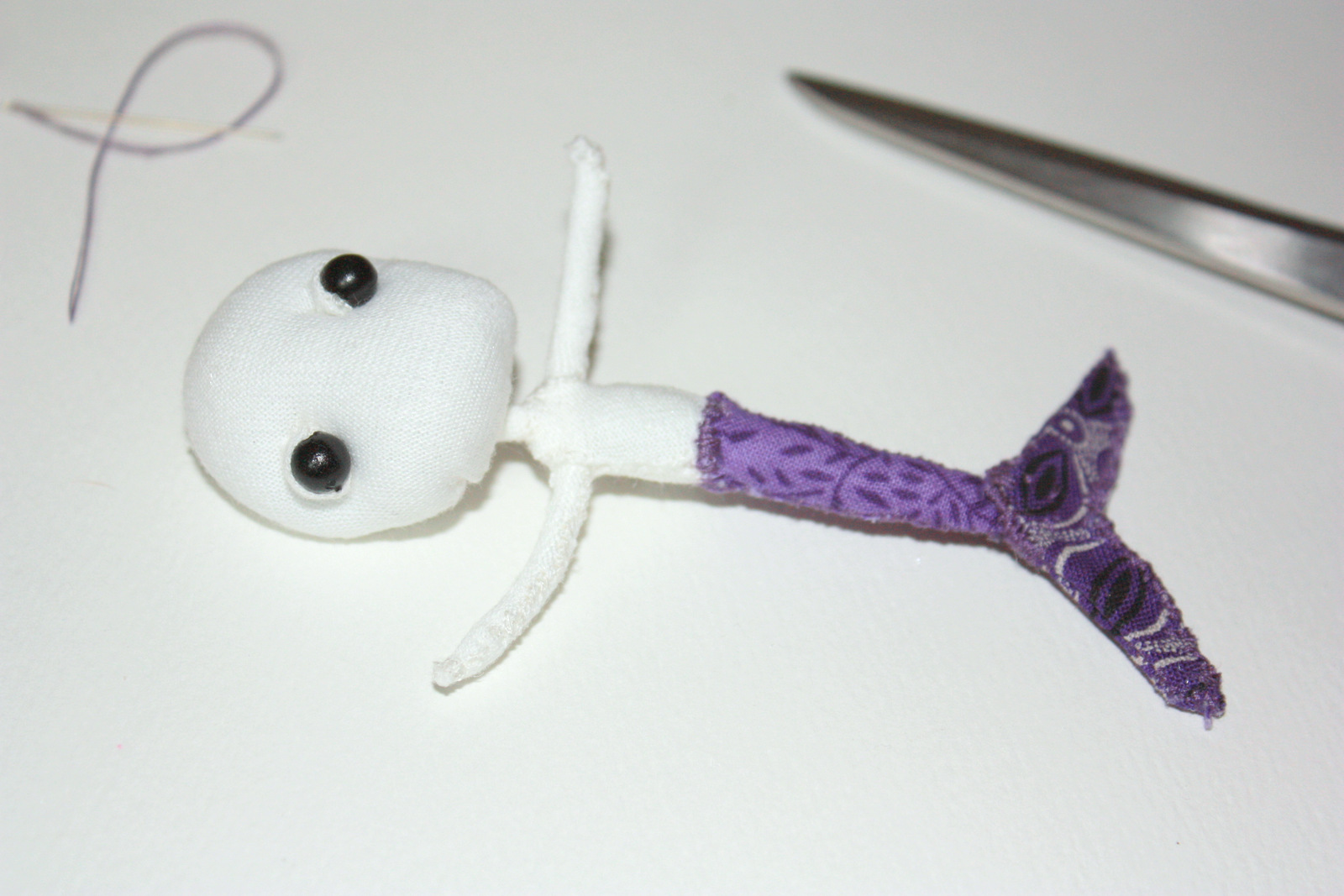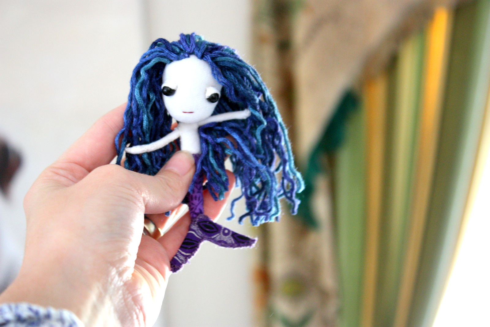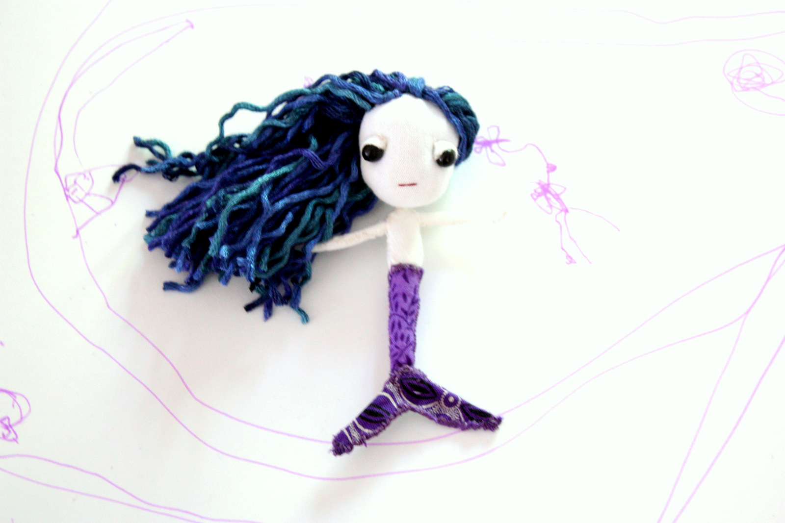 Here is a short ‘sneak peek’ of what I have started working on. She is a small, plush mermaid brooch and pocket friend doll.